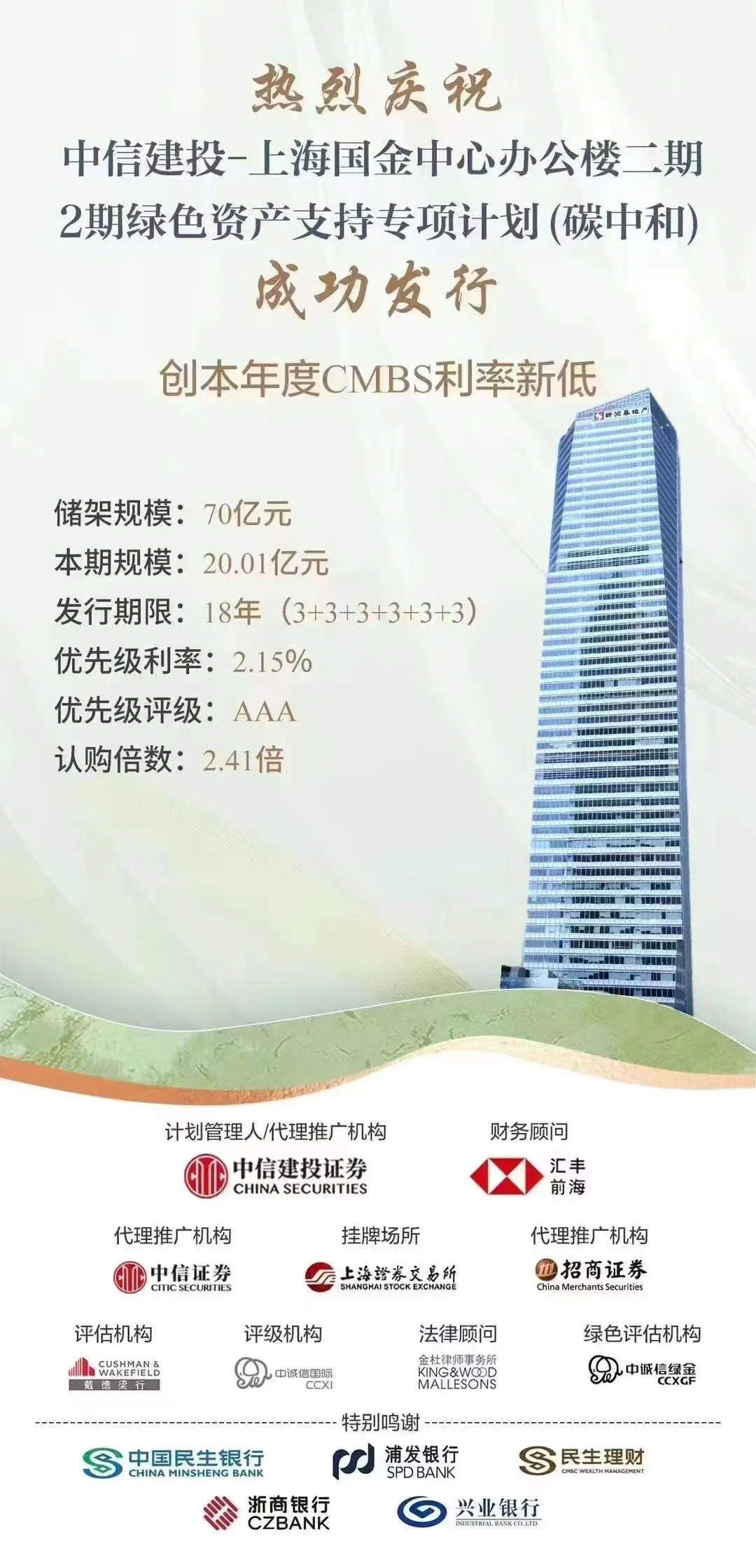 近日,中信建投-上海国金中心办公楼二期2期绿色资产支持专项计划(碳中和)在上海证券交易所成功设立。储架规模70亿元人民币,本期规模20.01亿元人民币,发行期限18年(3+3+3+3+3+3),AAAsf评级,票面利率2.15%,创本年度CMBS利率新低。全场认购倍数高达2.41倍,显示出资本市场对发行人和标的物业的高度认可。汇丰前海证券在本项目中担任财务顾问角色。