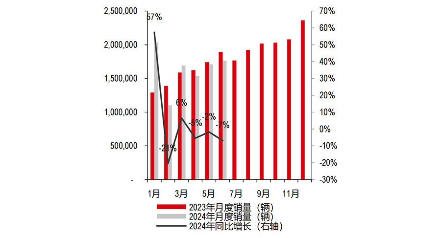 2024年6月整体汽车市场零售销量同比下滑 7%,但环比增长 3%