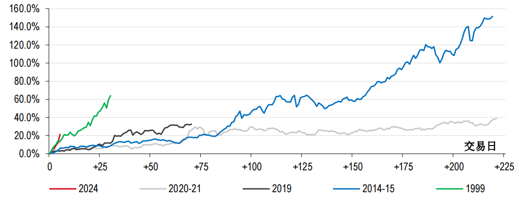 我们将此次上涨与2020-2021年、2019年、2014-2015年和1999年的四次上涨进行了比较,得出以下主要结论: