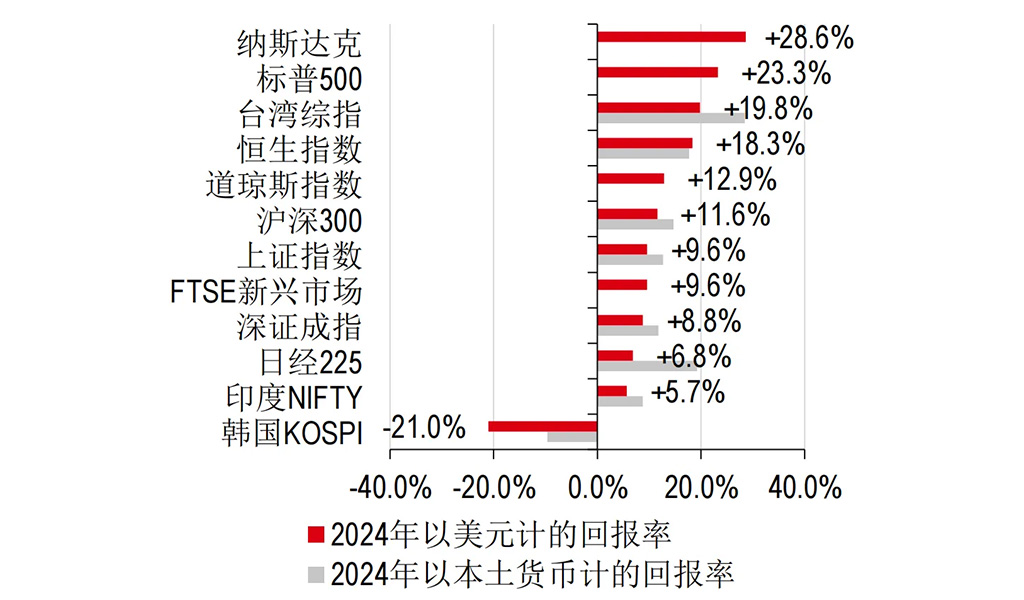 中国股市在2024年大部分时间横盘调整,去年9月底政策转向后出现非常强劲的反弹,恒生指数和沪深300指数跑赢亚洲其他主要市场(如日本和印度),按美元价格回报衡量尤为明显。