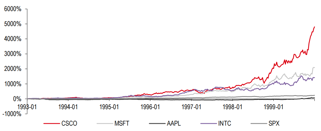 1993-1999年科技巨头股价表现比较:思科(4805%)> 微软(2088%) > 英特尔(1414%)> 标普500指数(237%) > 苹果(72%)