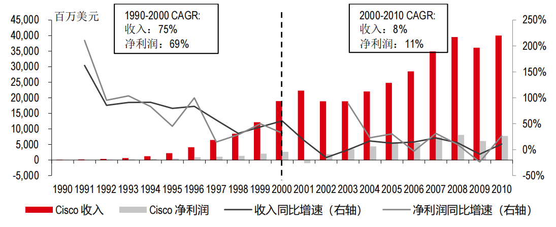 思科:2000-2010年收入和归母净利润增速较1990-2000年大幅下滑