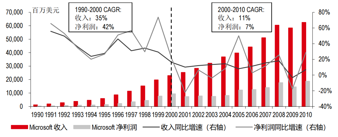 微软:1990-2000年收入和归母净利润均实现强劲增长;2000-2010年收入增长因高基数而放缓,但其增速仍高于我们本篇所讨论的的硬件公司。