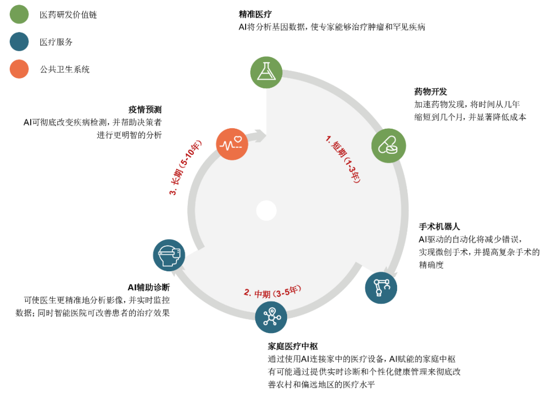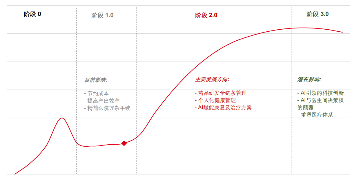 - 1.0阶段:流程优化和效率提升。AI已帮助医院优化药物使用监控等流程,并提升了营销精准度和药物审批速度。尽管我们仍处于提高运营效率的阶段,且AI应用尚未实现直接变现,但其影响显而易见——提高工作流程效率和资源分配智能化程度。