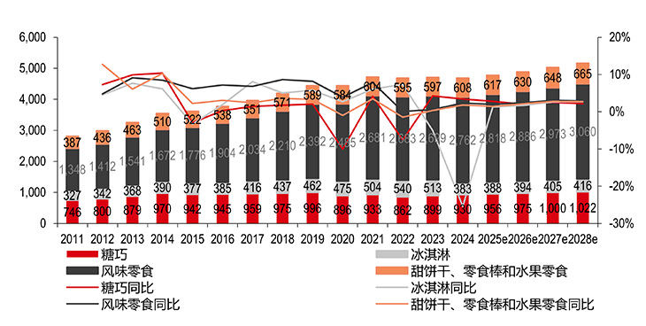 根据欧睿,2024年中国零食市场规模为4683亿元(约占全球市场的10%),仅次于美国。以人均消费来看,2024年中国零食市场人均消费为45.9美元,不及全球平均水平(82.1美元)。2011-2014年、2015-2019年、2020-2024年期间,中国零食市场规模的年复合增速分别为8%、5%、1%,欧睿预测2025-2028年增速为3%,至2028年达到5162亿元,量价的年复合增速分别为1%和2%。