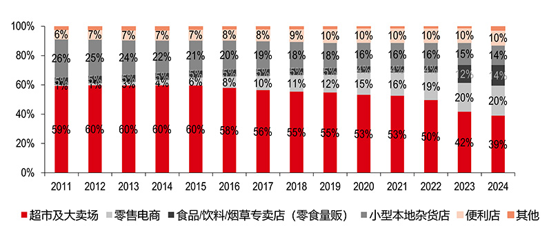 根据欧睿,2024年中国零食市场的销售渠道主要是超市及大卖场(占比39%)、零售电商(20%)、零食量贩(14%)、小型本地杂货店(14%)和便利店(10%)。从结构变化趋势来看,零食量贩和电商等新兴渠道正在获取传统流通渠道的份额。根据万辰集团公告的《重大资产购买暨关联交易报告书》,中国量贩零食市场规模已从2019年的40.8亿元增至2023年的706.7亿元,年复合增速达104%,2023-2028年年复合增速或将达到27.2%。