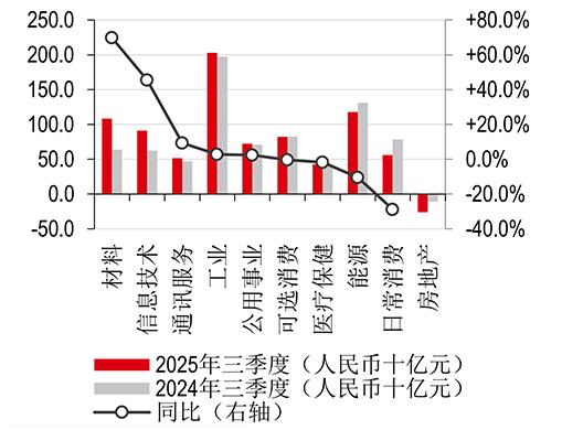 2025年第三季度:A股公司归母净利润总额达17058亿元,同比增长11.5%(2025年第二季度同比增长1.5%);剔除金融后A股公司归母净利润总额同比增长4.2%(2025年第二季度同比下滑1.8%)。盈利增速最高的两个板块为材料(同比增长69.8%,主要得益于黄金和钢铁价格的上涨)和信息技术(同比增长46.0%,主要得益于AI相关订单的改善)。同时,我们观察到日常消费板块归母净利润同比大幅减少28.8%(主要源于白酒销售疲弱和猪肉价格下跌),房地产板块亏损加深。