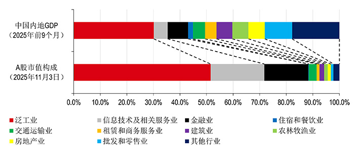 例如,以2025年前九个月的GDP构成作为基准,房地产板块在A股市场中的占比被压低(A股市值占比1.1%,而GDP占比为6.1%)。相比之下,泛工业、信息技术及相关服务以及金融业的占比则被抬高。造成这种差异的原因有三: